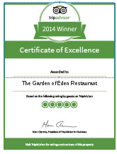 Once again we did it for 2014 and we are proud to announce that for 3 consecutive years The Garden of Eden has been the recipient of Trip Advisor's Certificate of Excellence 2012, Certificate of Excellence 2013 and Certificate of Excellence 2014.